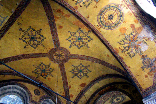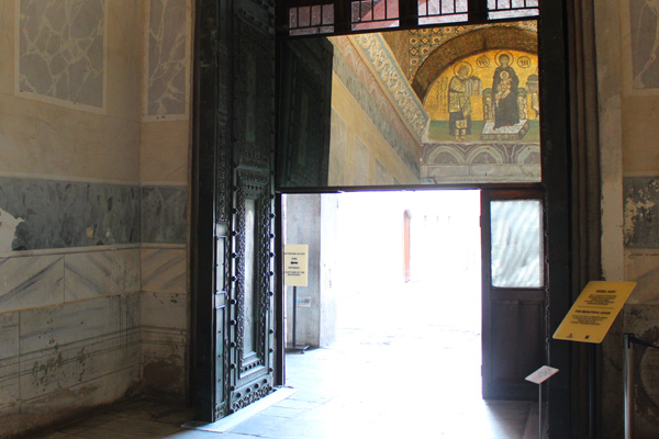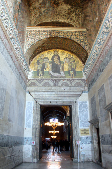 Format of the mosaic is semicircular, and it also shows an indication of space. Even though its background’s colour is gold, the low part, containing the characters, is green, therefore marking the ground. The heads of all the characters, including the two emperors, are surrounded by aureolas, thereby classifying the emperors themselves divine, or sacred. The mosaic is realized particularly meticulously, with numerous details on the emperor’s outfits and crowns. Next to them are different inscriptions celebrating their rulership.“This mosaic is not just a mere artistic expression of a certain theme, but it shows a distinct relation of the Church and the Empire with God, who bestows his blessings to the church, the ruler and the state.“.6 Remarking glorious ancestors, and the setup of the Empire’s capital city, and its primary church, signifies the reconstruction of the city and the entire Empire under Basil II.