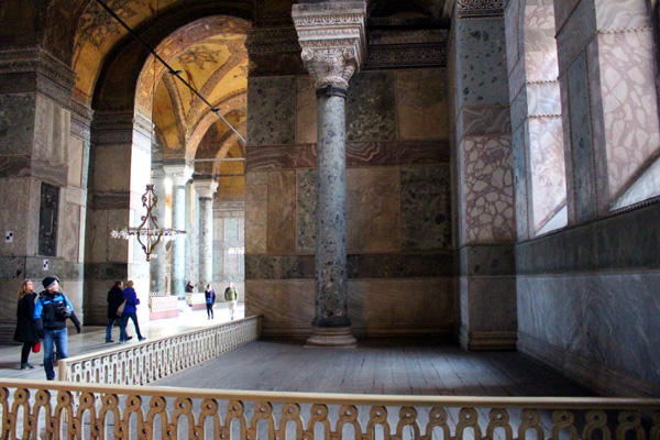 The earlier lodge was located on the apse, but Gaspere Fossati designed the new lodge in 1847 and replaced it against the pier to the north of the apse. The lodge was used by Sultan to join the rituals without being seen by public and it was also to protect the Sultan from possible assassins. The grills of the lodge are carved marble in Turkish rococo style, and the columns carrying the lodge are Byzantine.