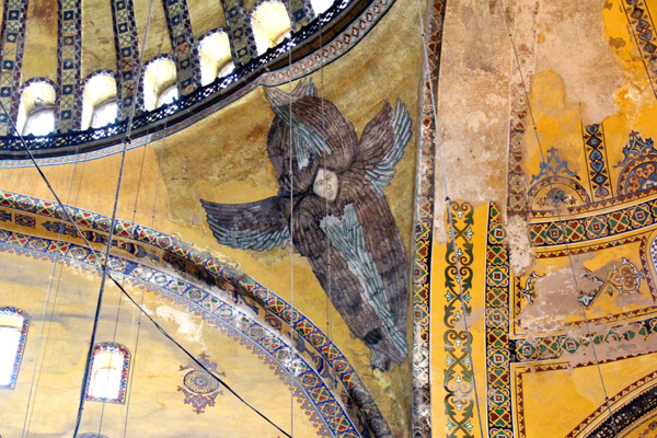 There are four seraphim mosaics (God’s protector angels with 6 wings) on the 4 pendentives that carry the dome. The four seraphims’ faces were covered with 6-7 layers of plaster for almost 160 years during the sovereignty of Ottomans. The last person who saw the faces of the seraphims was the Swiss architect Gaspare Fossati while he was holding the restoration at Hagia Sophia in 1840s. With a 10 day hard work, experts managed to take off the 7 layers of plasters and reveal the face of one of the seraphims.