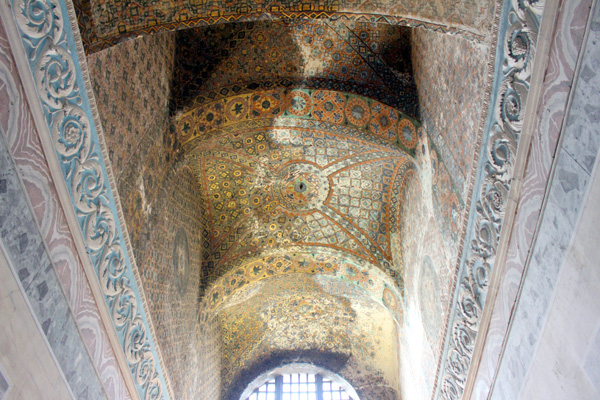 As you gaze up at The Virgin and Child mosaic and around the Hagia Sophia, you can’t miss the huge calligraphic roundels. The ones on the left and right of the mihrab say Muhammad and Allah. Other roundels include the first four caliphs Abu Bakr, Umar, Uthman and Ali, and the two grandchildren of Mohammed: Hassan and Hussain.