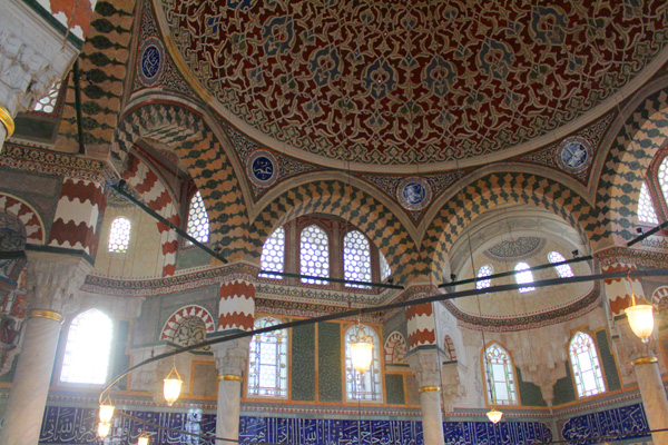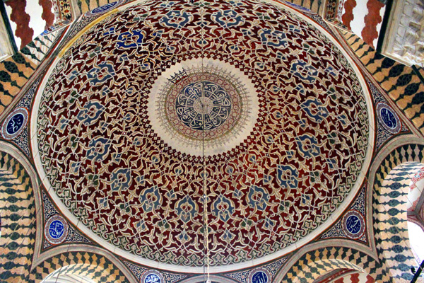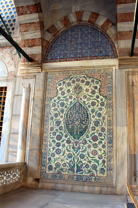 This building is one of the 18 tombs built by Architect Sinan. It has the most beautiful examples of stonework, woodwork, tiles and calligraphic arts. Architect Sinan got an order from Sultan Selim II to build a tomb for him. It is known that the tomb could be completed 3 years after death of Sultan Selim II. The facade of the building is coated with marble. Entrance door of the structure has inlaid mother of pearl which is known as Kundekari Style and decorated with geometrical tortoise shells which is an exclusive example of woodwork. Each side of the door has the tiled panels with purple, blue, green and red flower patterns which show 16th century tile workmanship. Left side of the door has replica tiles which has paler colour than right side ones because original ones were sent to France for restoration in 1895 and they are still in the Louvre Museum.