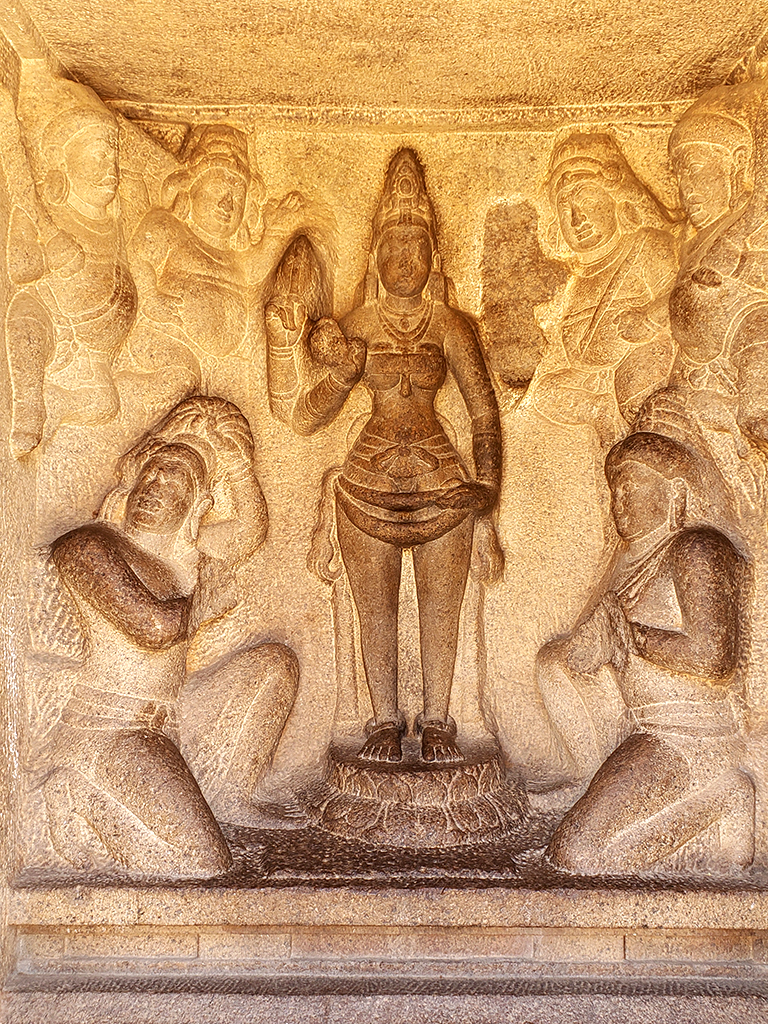 In one interpretation, a figure in the relief who is standing on one leg is said to be Arjuna performing an austerity Tapas to receive a boon from Shiva as an aid in fighting the Mahabharata war. The story of the penance is narrated in the epic Mahabharata under the subtitle the Kiratarjuniya. The boon, which Arjuna is said to have received, was called Pasupata, Shiva’s most powerful weapon. According to the myth narrated on this event, asuras (demons) sent a boar to kill Arjuna. Then Shiva appeared on the scene to protect Arjuna assuming the form of kirata (hunter). Both Arjuna and Shiva shot arrows at the boar and the boar was killed; both claimed credit for killing it and a fight ensued between the two in which Shiva won. He then revealed his true self to Arjuna and blessed him and gave him the weapon for which Arjuna is shown performing the penance.
