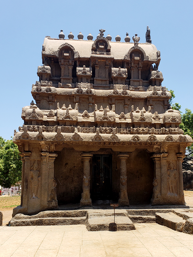 This ratha is similar in form to the Dharmaraja Ratha except that it has one less tier at the top, and has an octagonal dome with a stone lion carved in the front yard. The walls of the ratha are carved into panels with fourteen sculptures. Four of these are dvarapalas, one Vishnu, a rishi (sage) with a student, a Kartikeya (Murugan) which could alternatively be Indra, one Shiva with Nandi, and the rest are human beings shown in different stages of their life including couples.